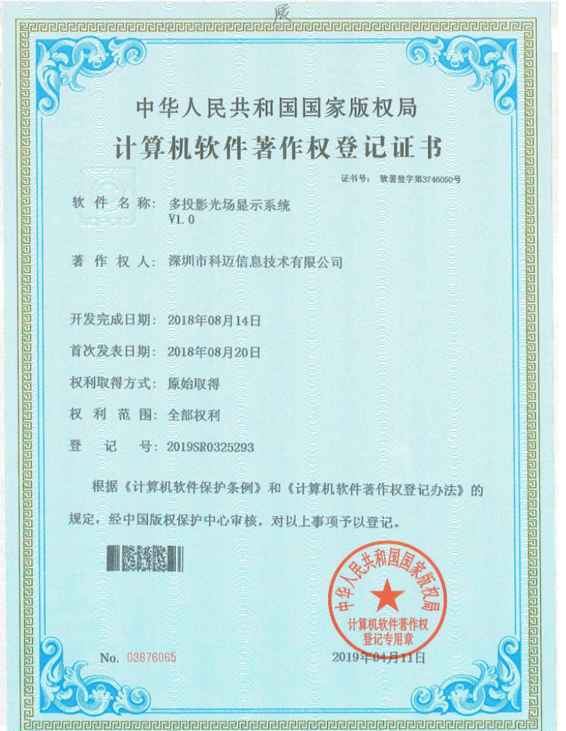 | 软件名称 | 多投影光场显示系统V1.0 |
