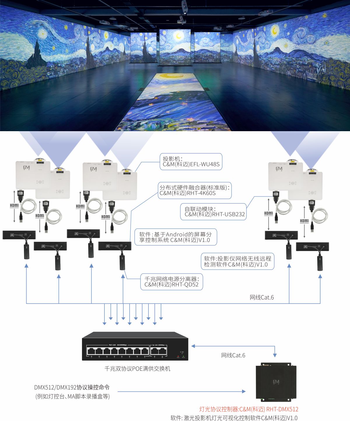 RHT系列多通道投影画面融合播放控制系统灯光协议控制器支持协议美型DMX192DMX512。